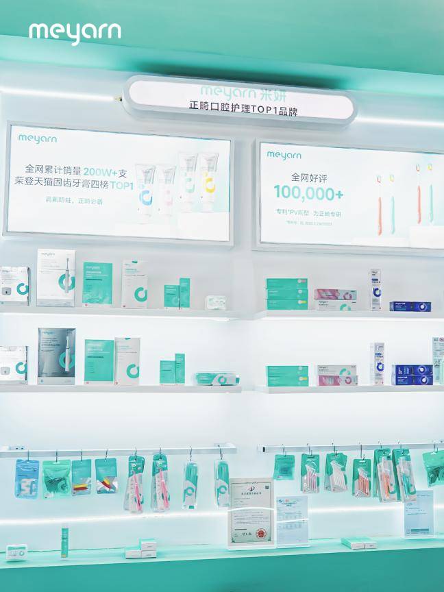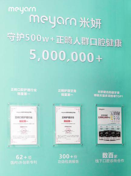 展台核心区域聚焦meyarn米妍丰富的产品矩阵,涵盖牙膏、牙刷、漱口水等全线产品。目前,meyarn米妍专业口腔护理产品已成功进入全国数百家口腔医院及诊所,部分核心产品已被纳入国家医保体系挂网销售,持续巩固专业渠道网络。在线上市场,meyarn米妍同样表现亮眼,持续领跑同类目销量,荣获华信咨询认证“正畸口腔护理行业销量第一”。其防龋牙膏表现尤为突出,累计销量已突破200万支,荣获“正畸护理牙膏销量第一”市场地位认证,充分印证了meyarn米妍在专业细分领域的影响力。